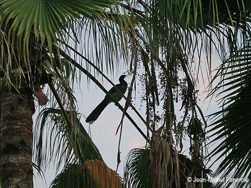 The capacity of flight is moderate and it rarely performs sustained flights. However, following a flurry of wingbeats, the bird makes long glides, and the long tail provides a good support. The short, rounded wings involve a weak, fluttering flight.