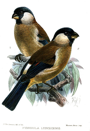 The White-cheeked Bullfinch is a restricted range species described as scarce or locally common.